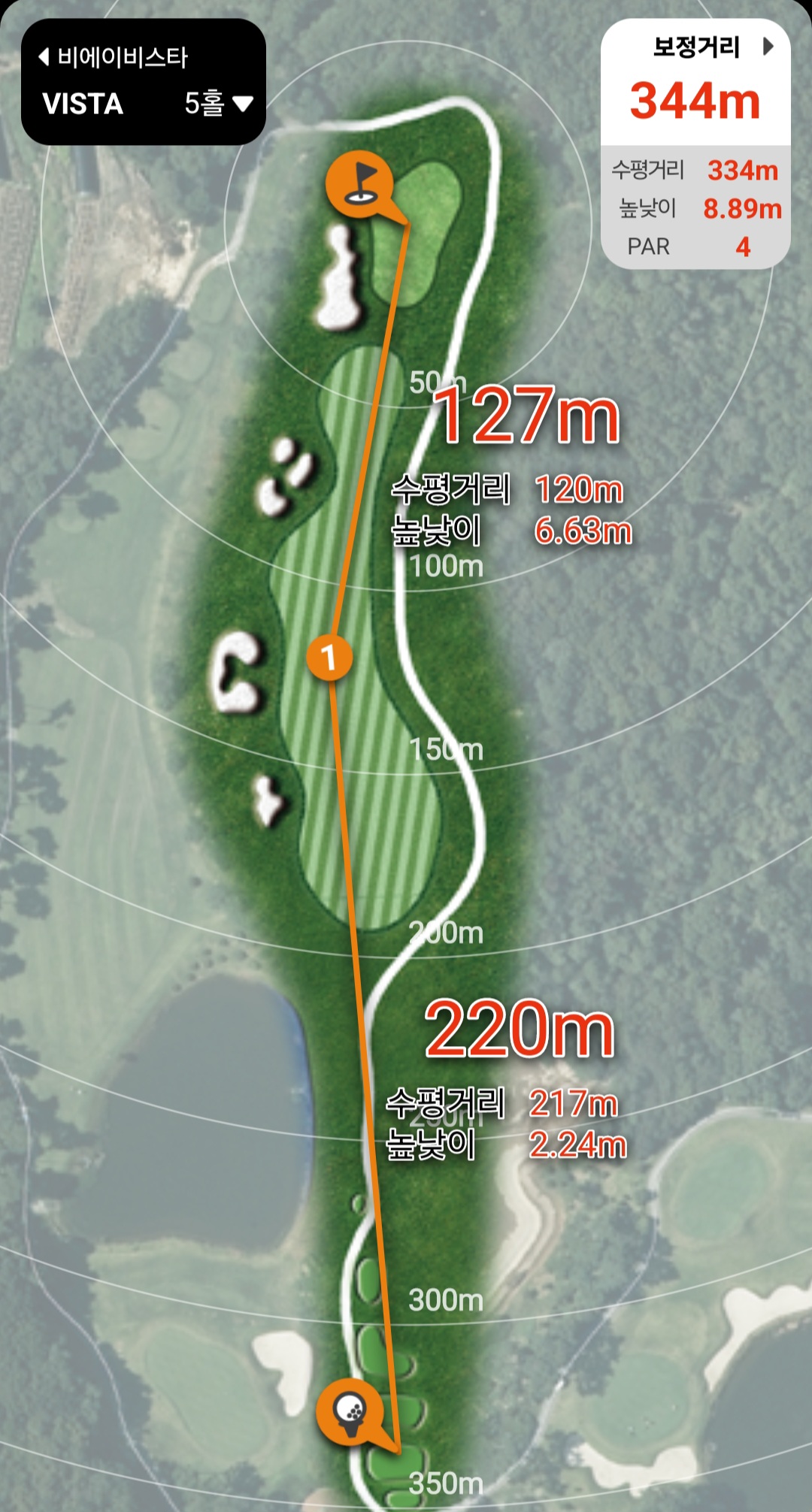 경사를 보정한 거리는 내리막을 반영하면 340~350미터 정도라고 계산해야 하겠습니다.