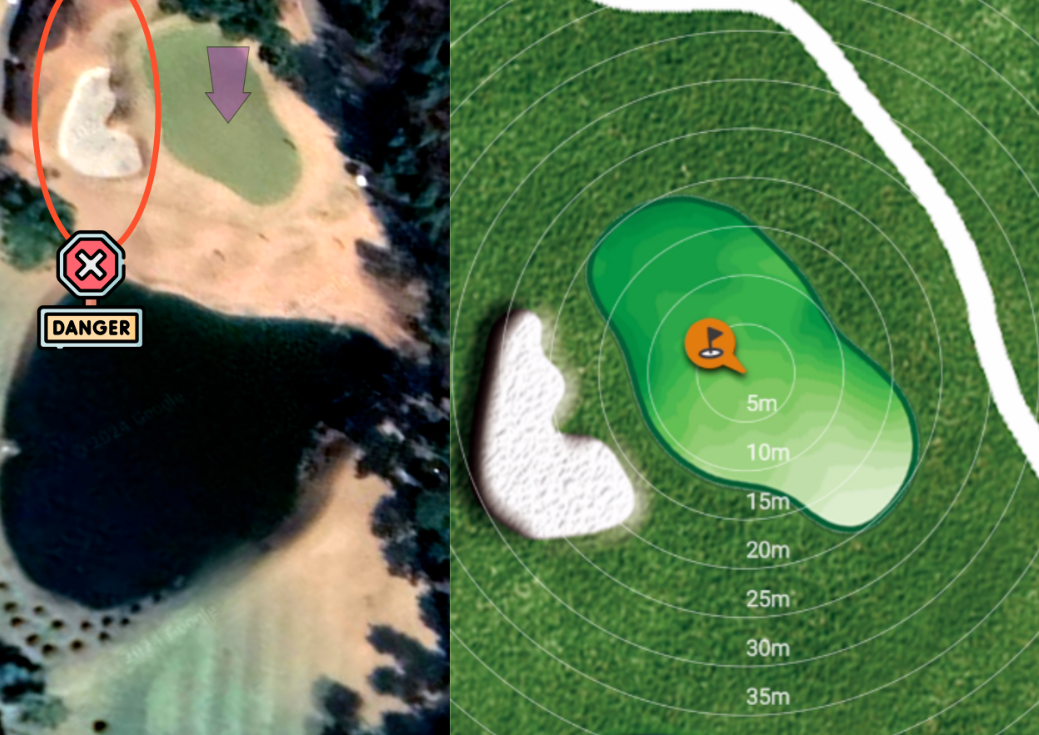 보통은 좌측 그린을 사용할 것으로 보입니다만 우측 짧은 그린에 핀이 꽂혀 있다면 버디나 이글을 노려야겠습니다.