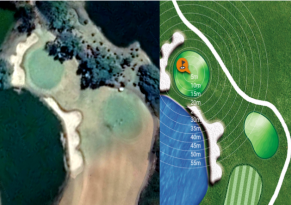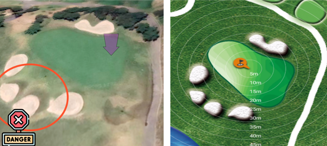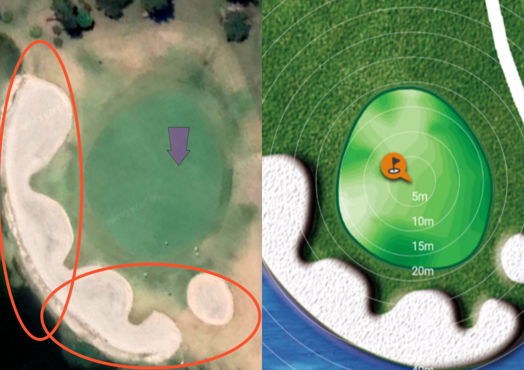 그린의 앞뒤 경사가 심하므로 꼭 짧게 공략해야 좋은 결과가 생긴다.