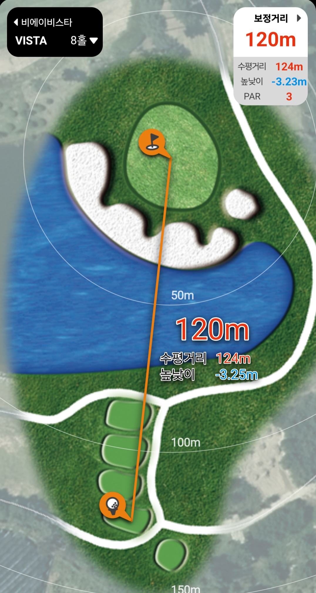 비스타 코스 8번 홀은 완만한 경사의 파 3홀로 120미터 정도의 전장이며 대형 연못과 벙커가 그린을 감싸고 있습니다.
