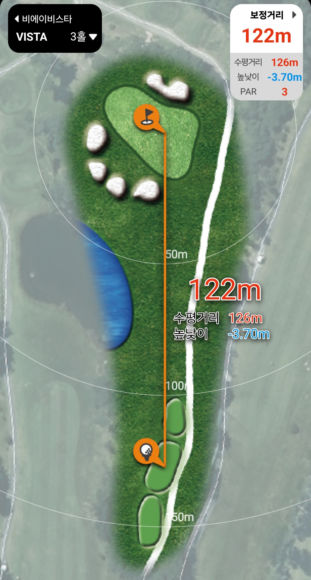 비스타코스 3번 홀은 122미터 파 3홀로 비교적 쉬워 보이지만 아래 구글어스로 보면 그린좌측이 내리막 경사가 심하고 깊은 벙커가 집단을 이루고 있습니다. 절대 피해서 티샷해야 합니다. 그린의 오른쪽을 공략하는 것이 안전합니다.